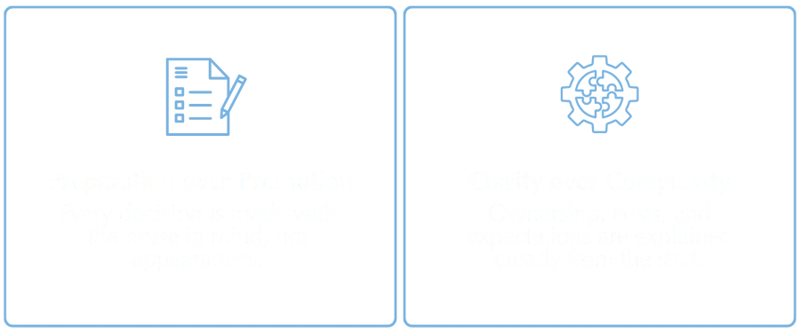 Ownership involves ongoing costs such as training, care, and racing expenses. These are discussed clearly as part of the ownership conversation so expectations are understood upfront.